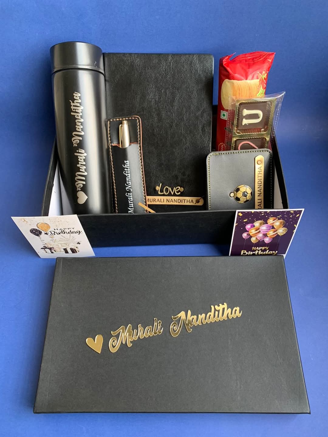 Embrace your loved ones with a luxury hamper. It includes 1 fancy box with a name on the box in acrylic font, 1 men's wallet, 1 charm diary, 1 LED temperature flask 3.0, 1 compass pen, 1 leather printed pen pouch, 1 potato biscuit, 2 Polaroid photo/ birthday cards, all compact together in 1 box. It looks quite graceful for a luxury gifting purpose.