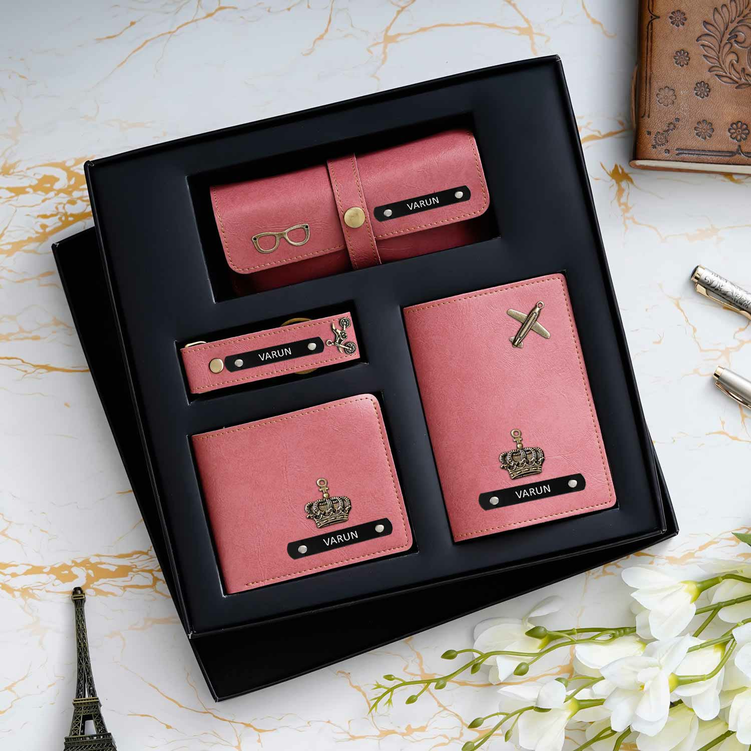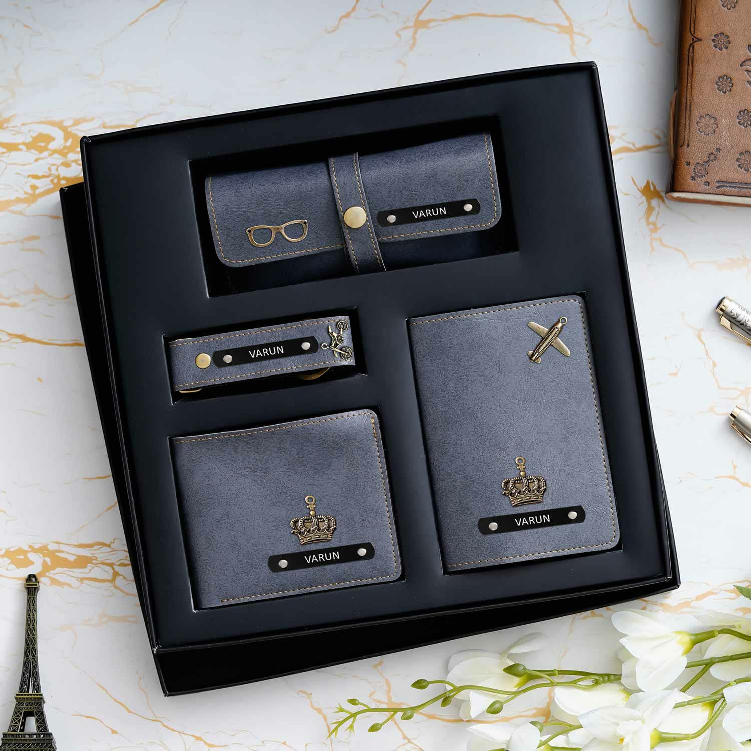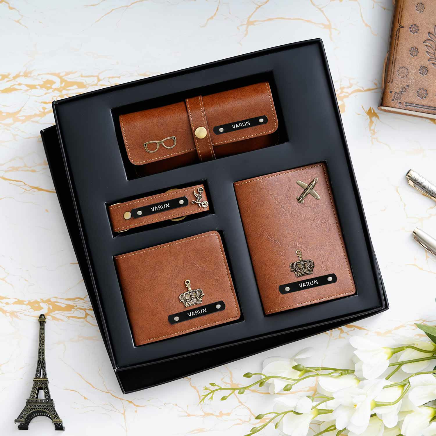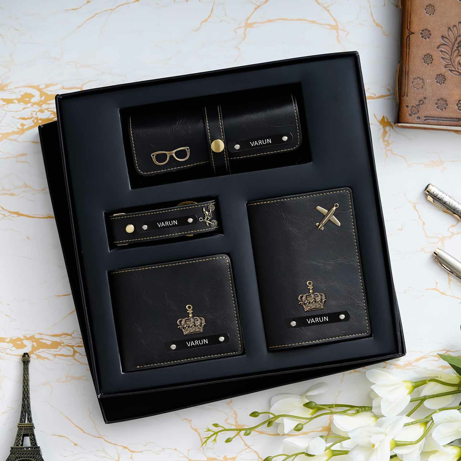 One of the latest trending items is a men's 4-piece combo. It includes 1 high-quality imported wallet, 1 pair of eyewear, 1 passport holder, and 1 keychain with a hook. All these items come enclosed in a premium box and are available in 9 iconic colors.