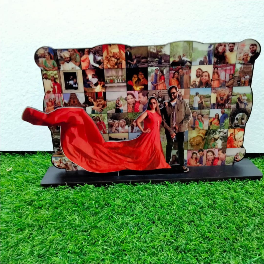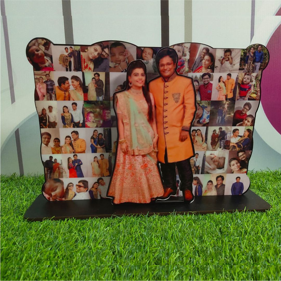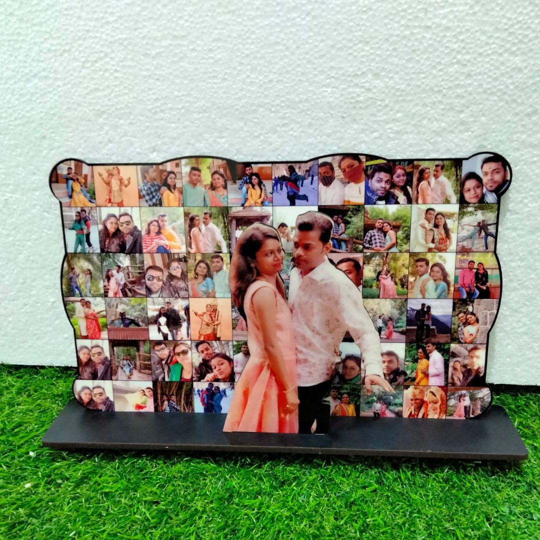 Double your celebration this season with this Mosaic Frame with Standy. It's a mosaic shape carved modern piece. Customize it with plenty of pictures and a full picture Stand with a small text.