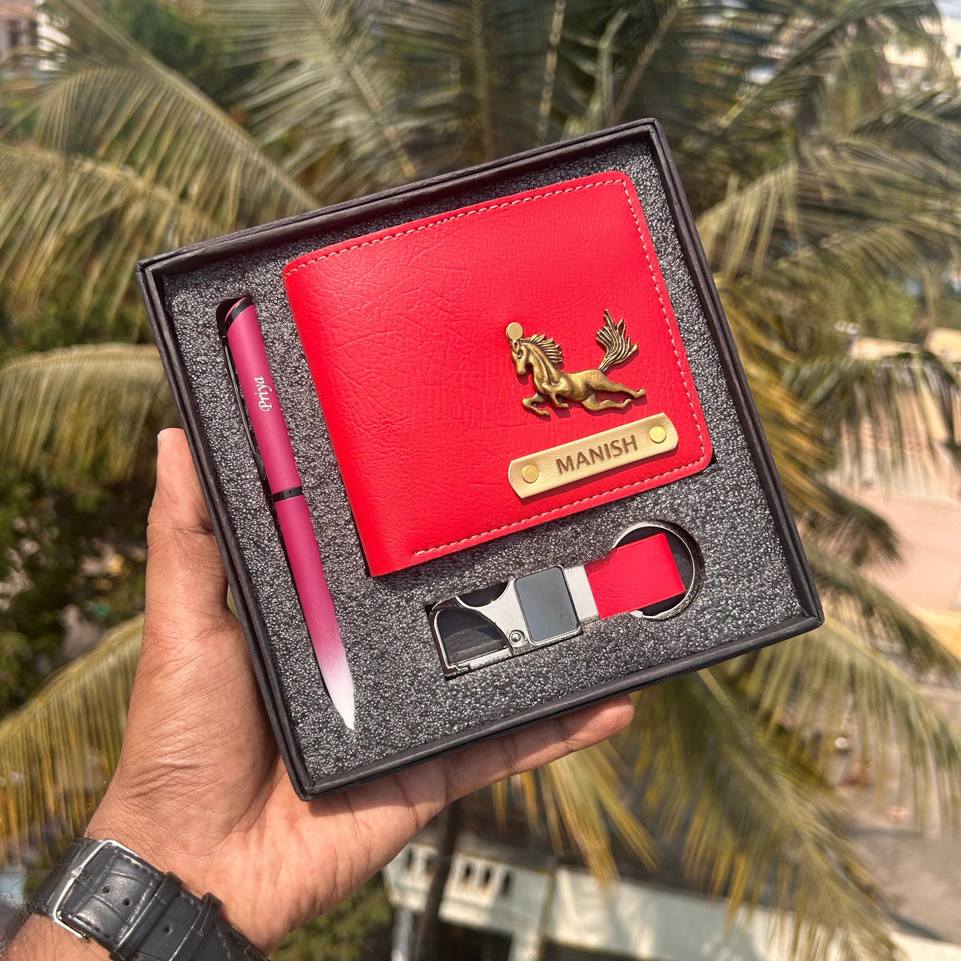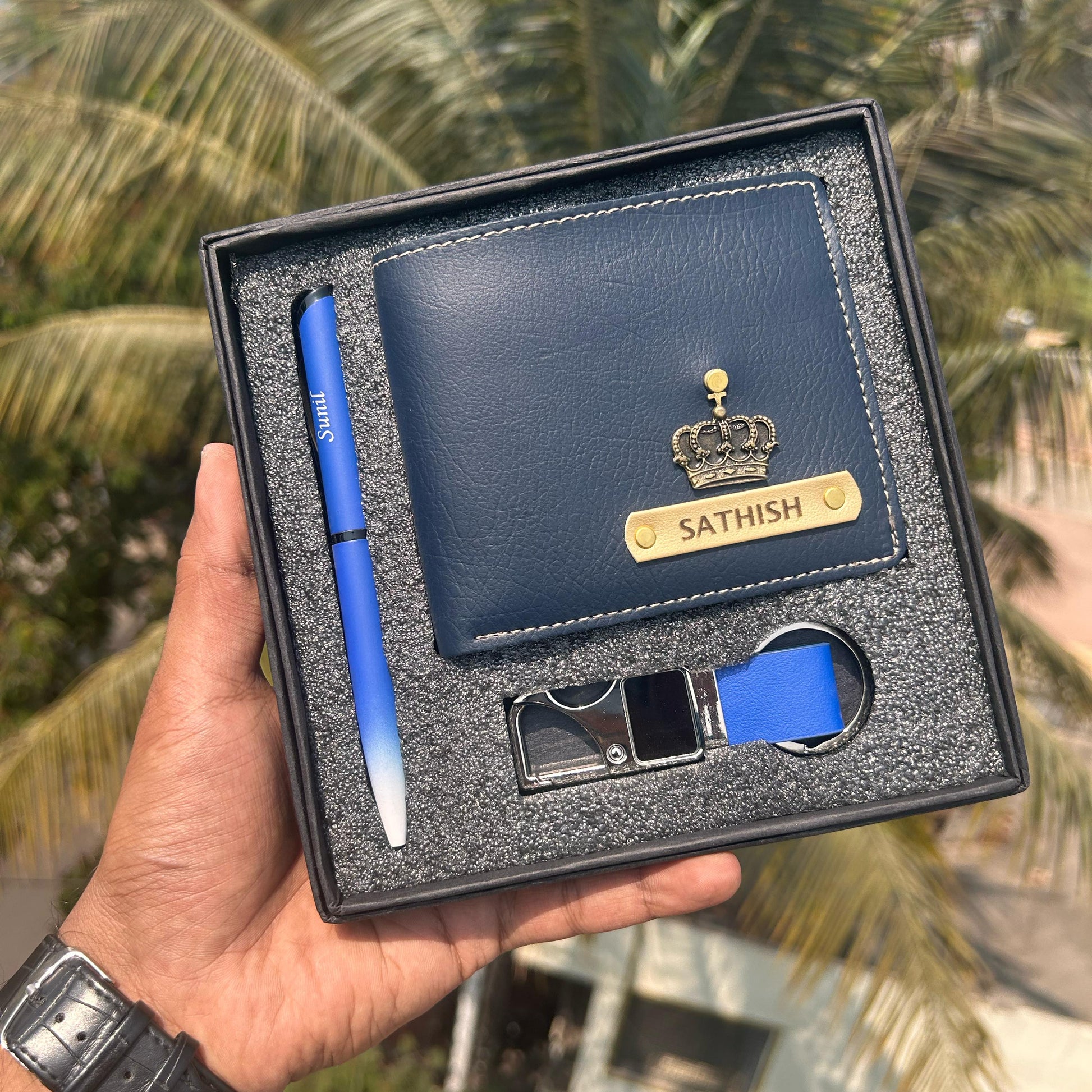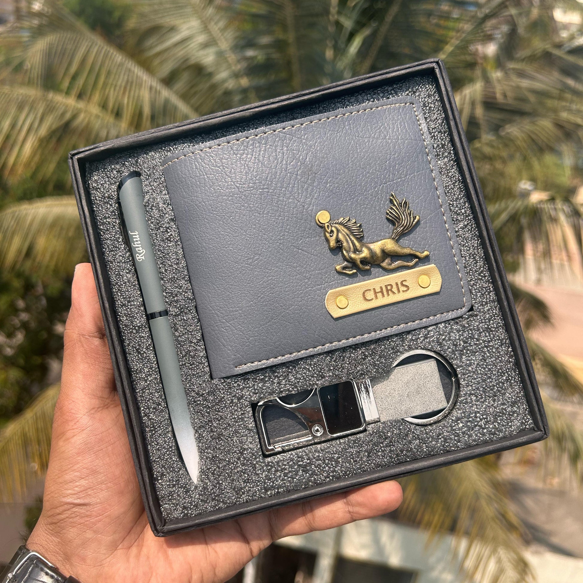 Scope of one name customized on the wallet, pen & keychain.