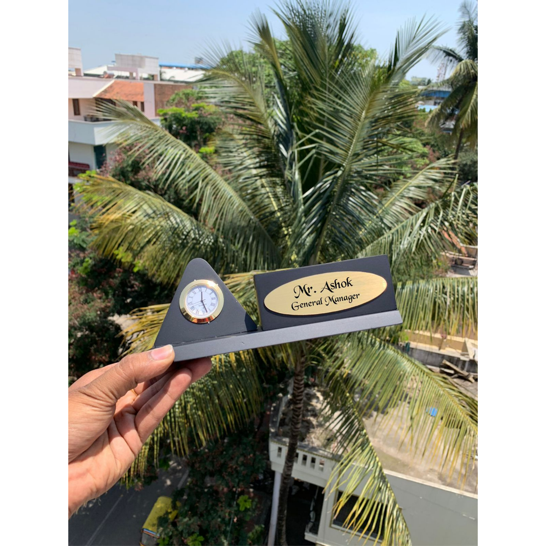 Upgrade your office table with a new design Pen Stand. It carries a tiny clock on a triangular board, a separate section for holding pens, phone decked with an oval-shaped golden nameplate. It looks radiant for gifting purposes.