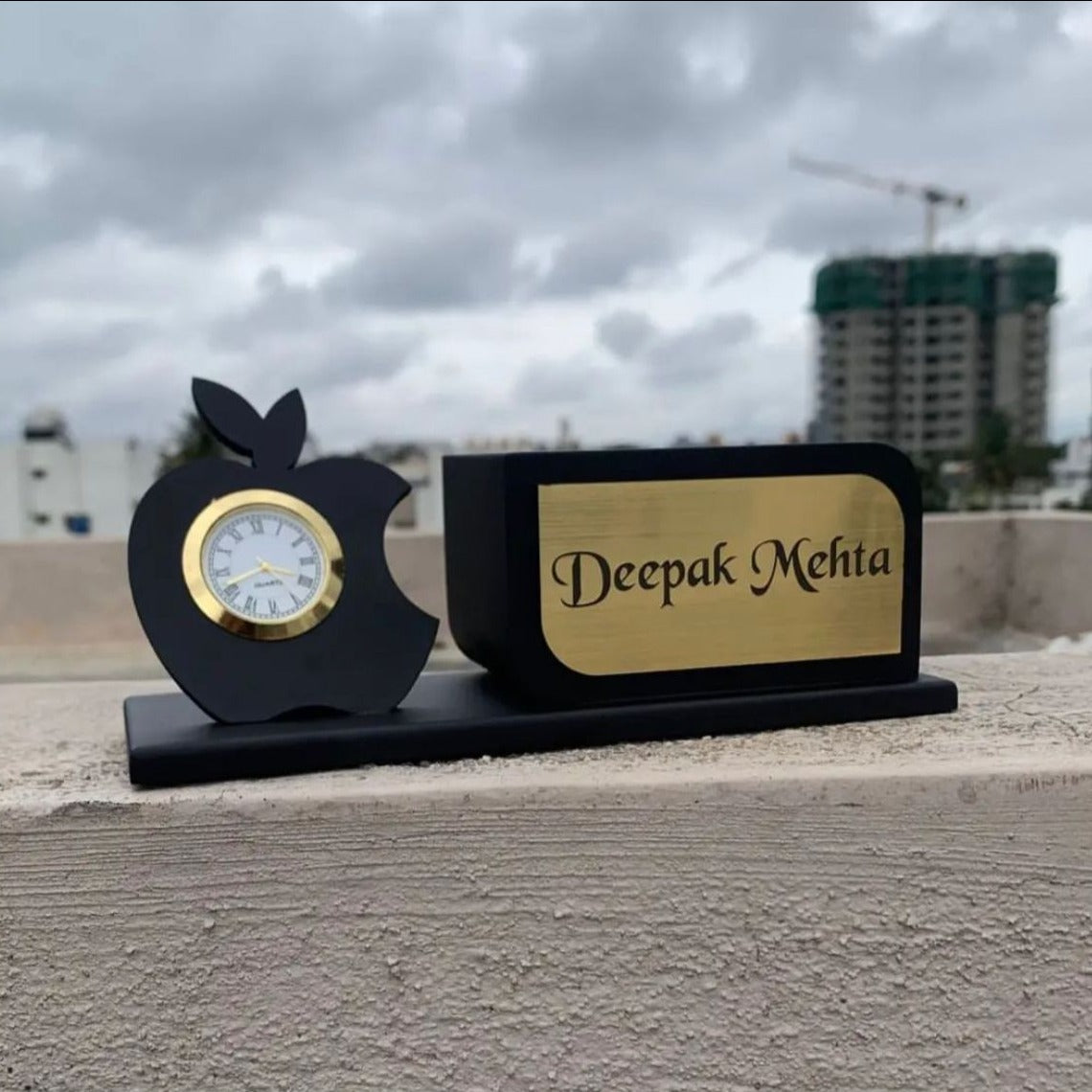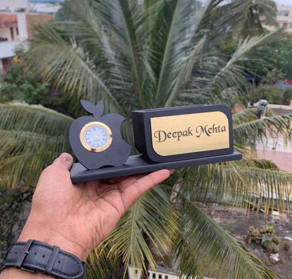A small simple and elegant piece of art, penstand 5.0 has a clock on an apple-designed top, parted section for mobile, pens, and cards with a large base. It also has enough space in front to customize your name/small phrase.