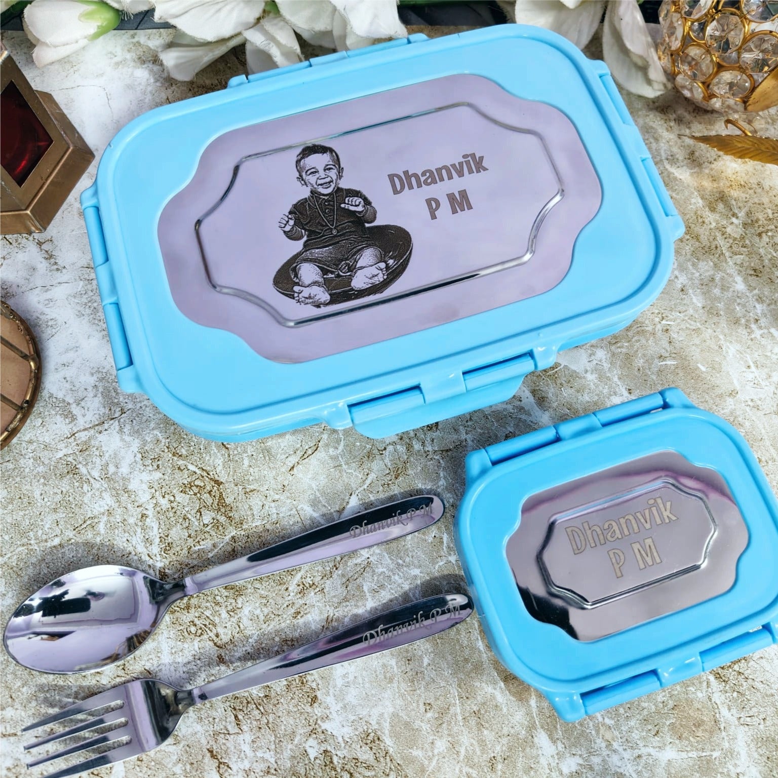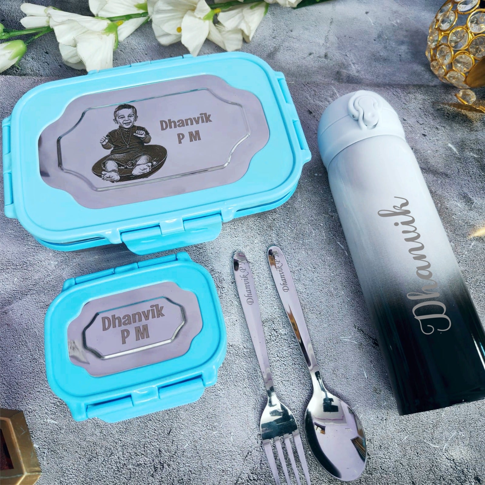 Scope of one common name engraved on the flask, lunch boxes & cutlery set, and pic customized on the big lunch box.