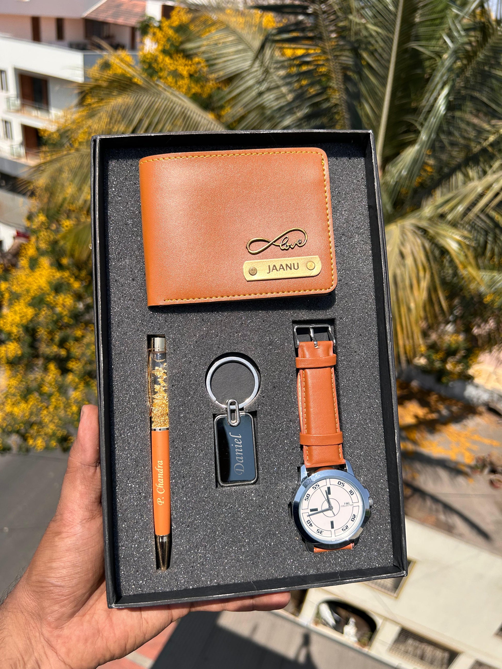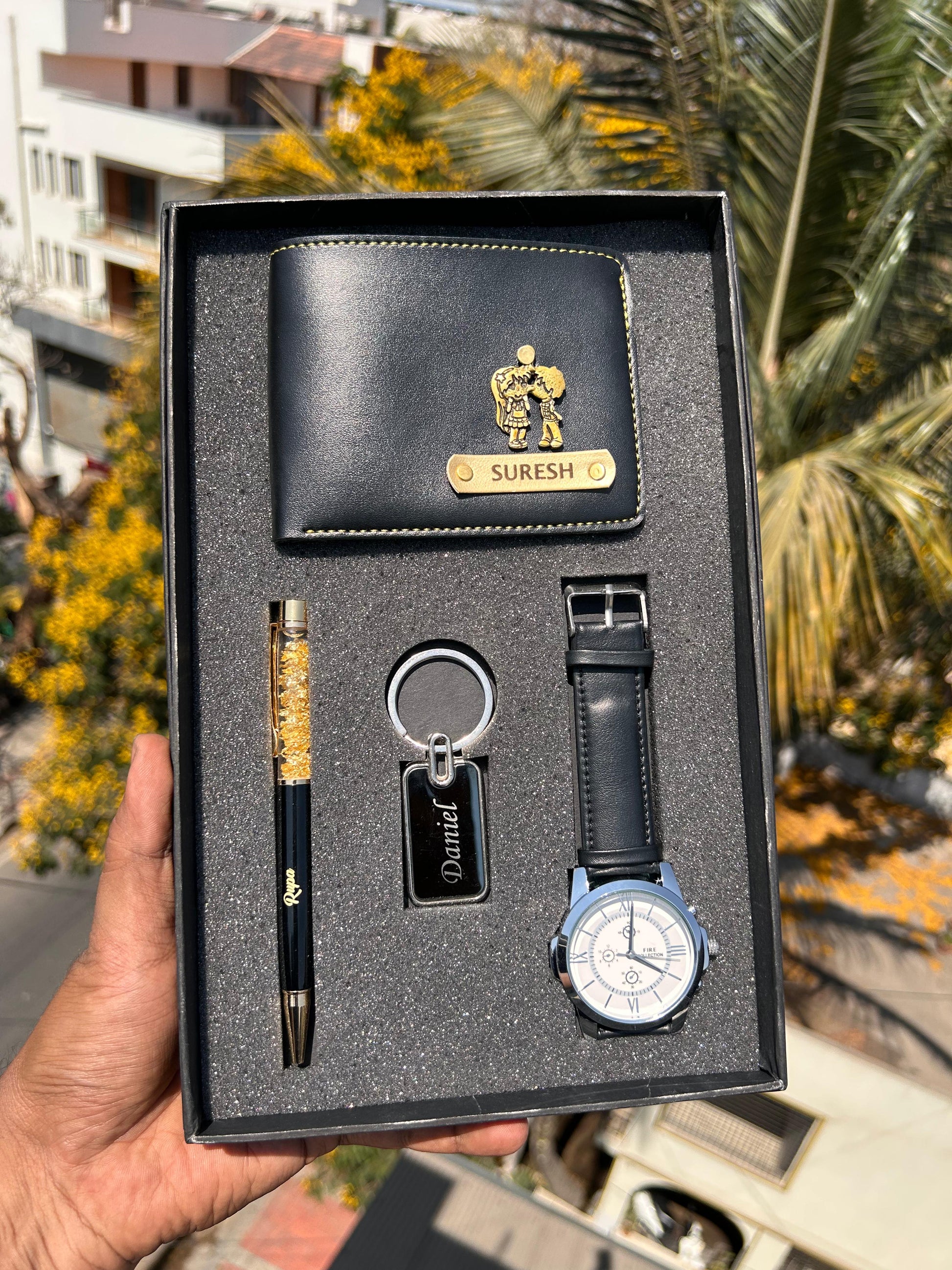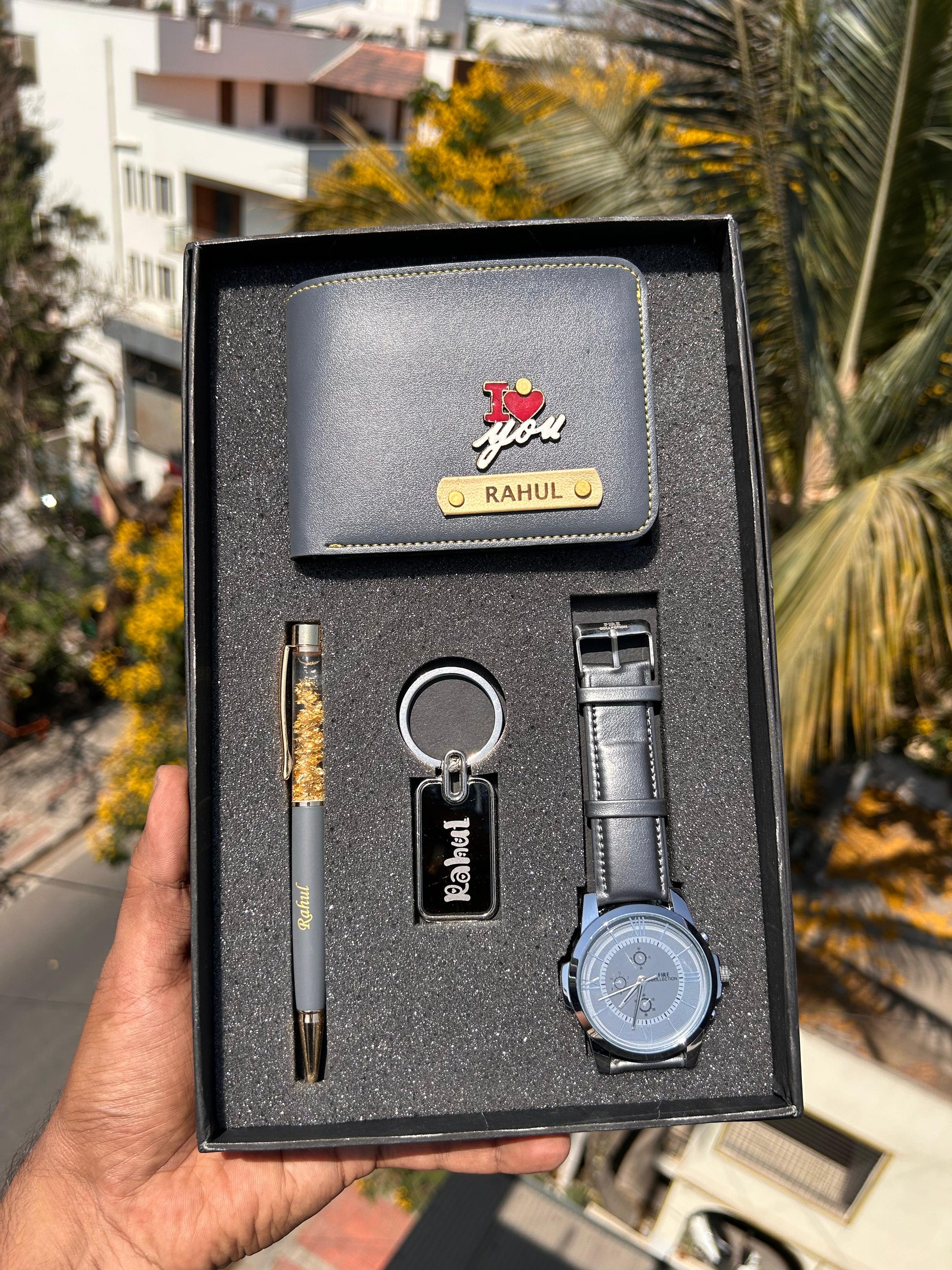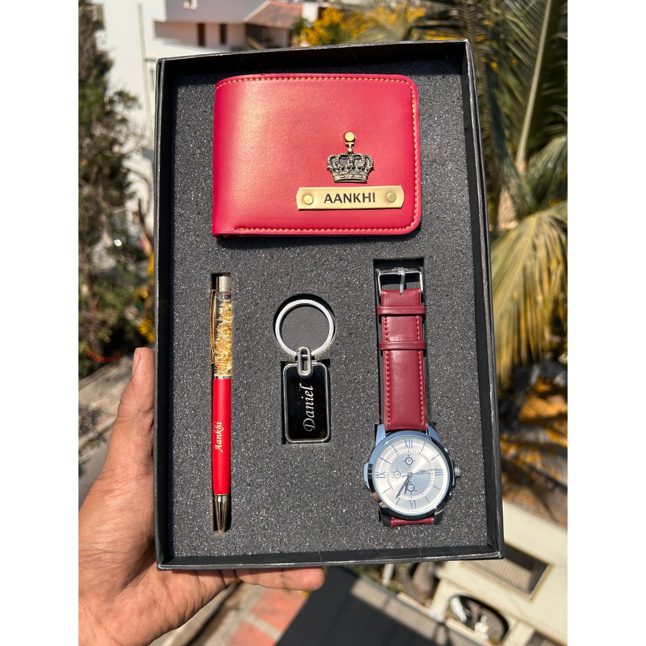 Scope of one name customized on the wallet, pen & keychain, and one charm customized on the wallet.