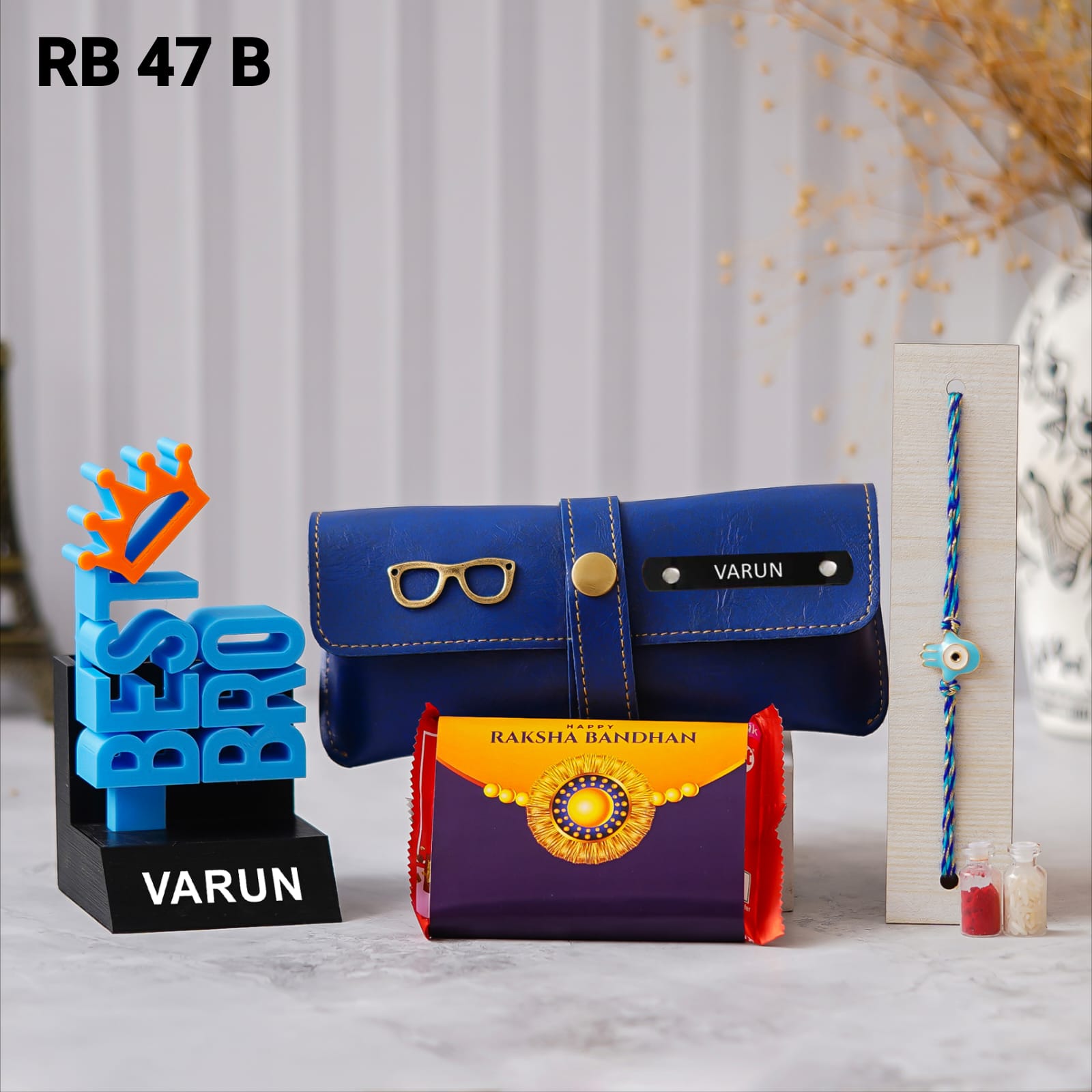 Scope of one name customized on pen stand, eyewear case & rakhi (if selected model A) and charm customized on the eyewear case.