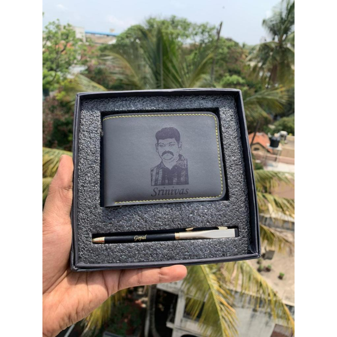 A box full of common gifts presented in an uncommon design is now your way. Inclusive of a unique customized wallet (picture and name of your choice in sketch form) and a name engraved pen. The wallet is available in 3 ideal colors, and you can choose a pen from the given list. It comes in a premium box.