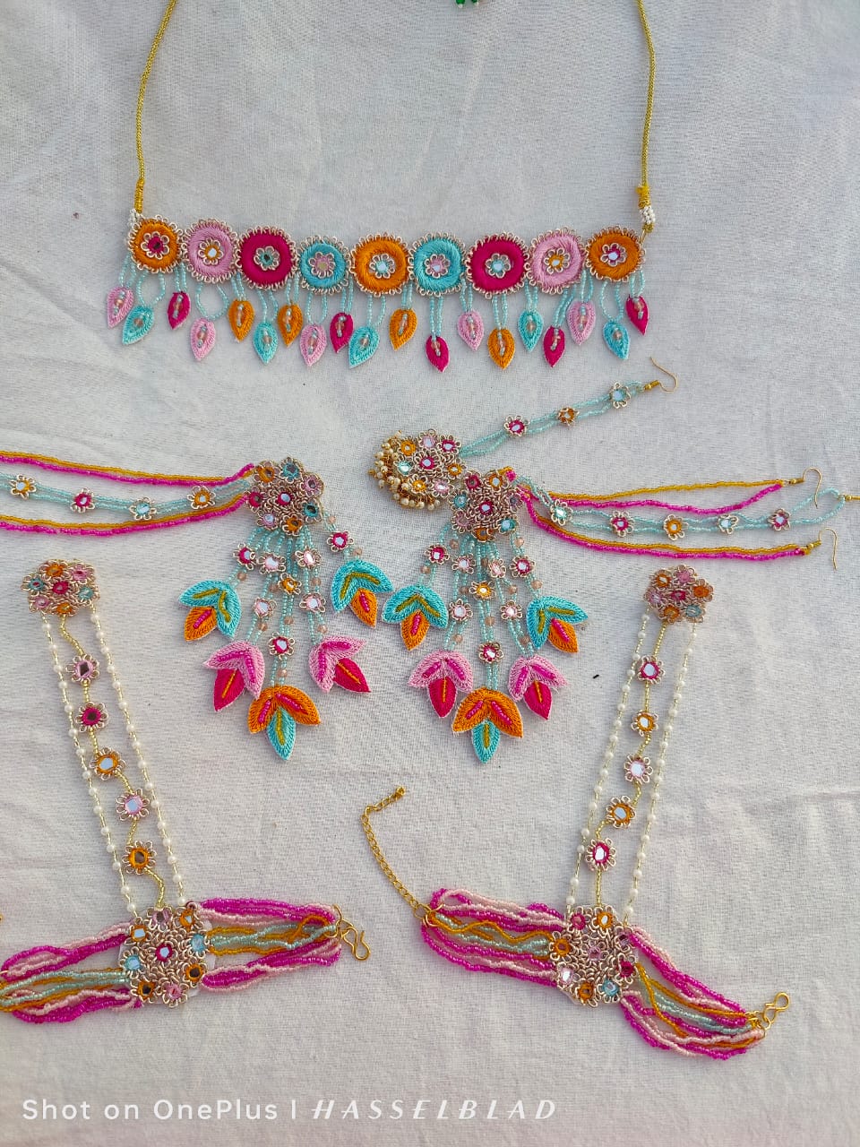 Make your haldi and mehendi look pop with Thread Jewelry Set 11.0. Featuring vibrant hues of colors with intricate floral designs and leaf danglers. Lightweight and perfect for a trendy yet traditional bridal look.