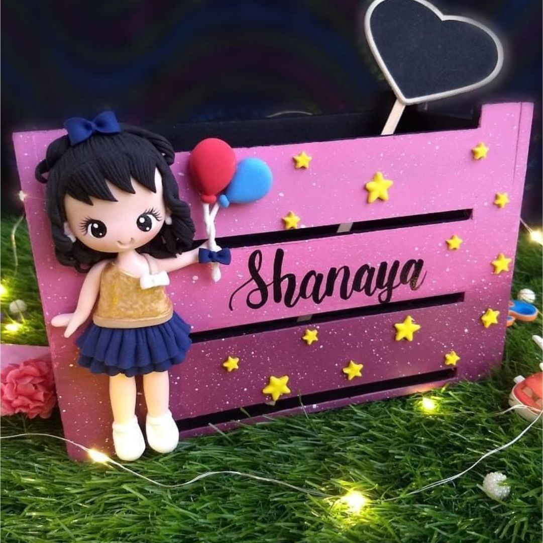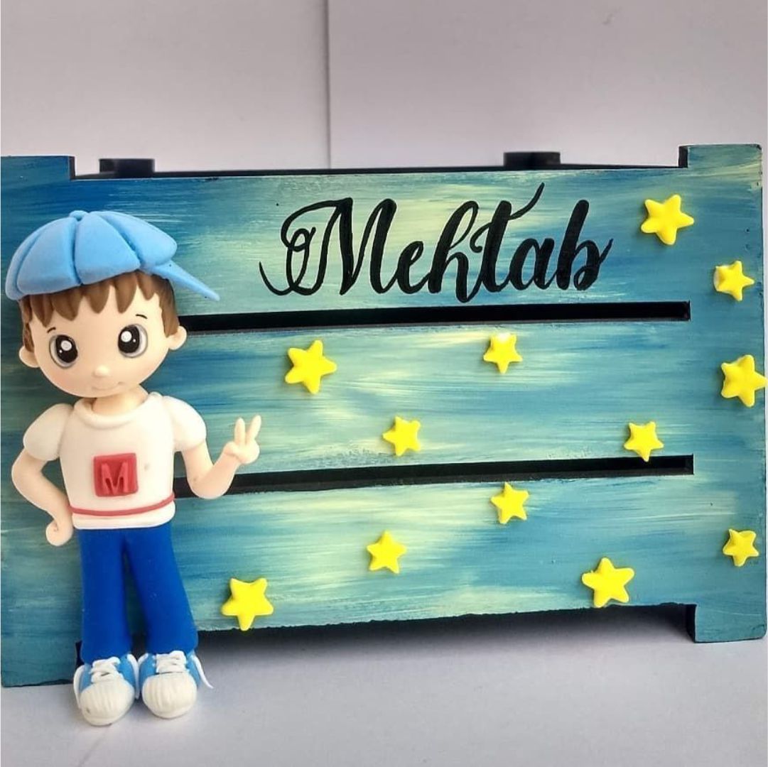 Size: 7.5"x7.5"x7" with name in calligraphy & clay doll.