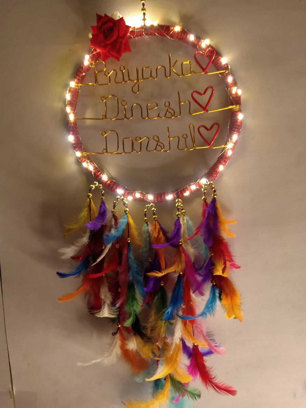 Decorate your home with our trendy wire art dreamcatcher 2.0. It is exceptionally designed with multicolor threads around the hoop, cherished with the rose, enlightened with LED lights, and garnished with colorful feathers and beads. In the center, it carries customized names drawn into golden wires with a red heart to make it look mesmerizing.